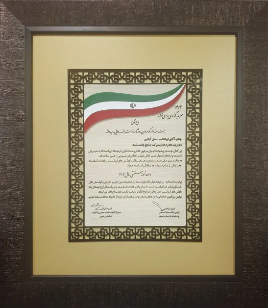 این انتخاب ارزشمند در مراسم روز صنعت و معدن با حضور مقامات عالیرتبه و فعالان برجسته حوزه صنعت و اقتصاد انجام گرفت و لوح تقدیر و تندیس ویژه این رویداد به مدیریت محترم شرکت، جناب آقای مهندس اسحق آبادی، اهدا گردید.